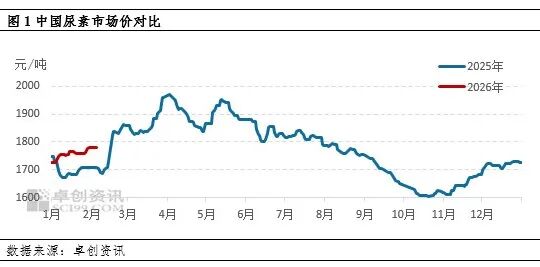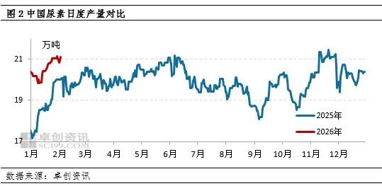 目前国内尿素整体处于全年备肥期,农业需求阶段性补单。工业需求基于复合肥、板材整体开工负荷略有提升,加之前期原料库存下降,因此新单补单意愿较为积极。与此同时,部分小单出口集港有序进行中。2026年1月,中国复合肥企业产能利用率为43.79%,较2025年12月同期提升1.91个百分点。目前国内复合肥市场高位运行,原料跟进尚可。基层用肥淡季,且种植收益不理想抑制,经销商逐级铺货不畅,回收货款乏力,冬储备肥主流到货6成左右。加之冬储备肥周期长,经销商逢低适量跟进打款,故原料尿素采购仍有延续。