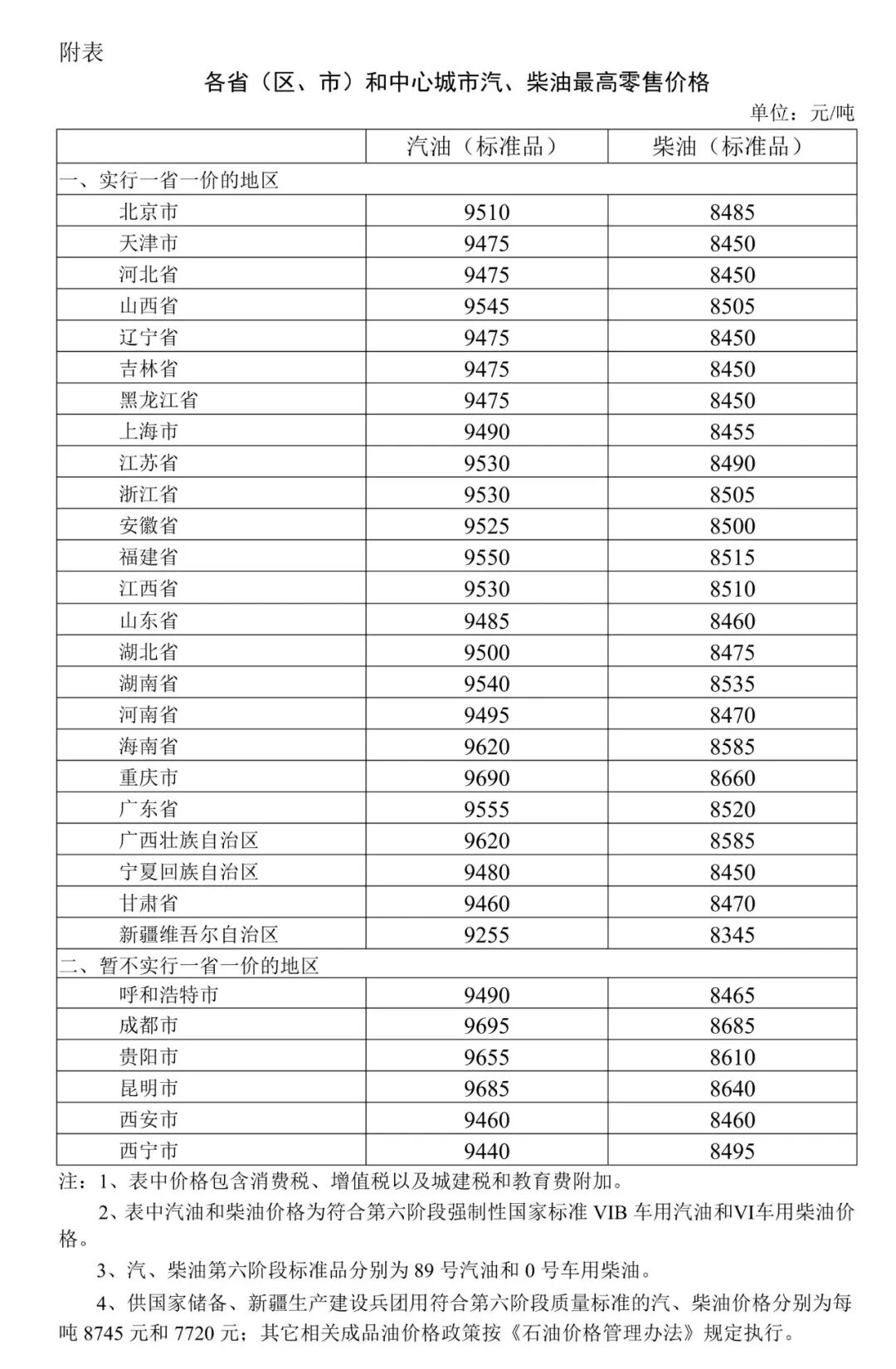 自3月9日24时起,国内汽、柴油价格(标准品,下同)每吨分别上涨695元和670元。调整后,各省(区、市)和中心城市汽、柴油最高零售价格见附表。
