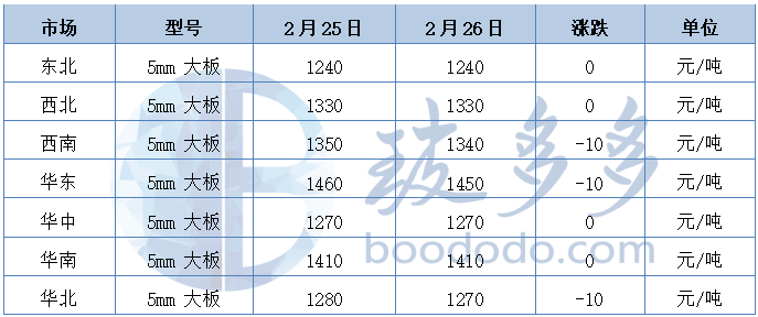 今日国内5mm浮法玻璃市场运行偏弱。其中西南地区、华东地区、华北地区浮法玻璃市场价格下调10元/吨,其他地区企业价格暂稳;而华北京津唐浮法玻璃成交重心下滑,终端需求尚未恢复;华东江苏、浙江地区下跌20元/吨,下游采购情况一般,多以刚需为主,市场价格仍承压。当前浮法玻璃现货市场产销走弱,下游多处于观望或按需采购状态,需求支撑力度有限。